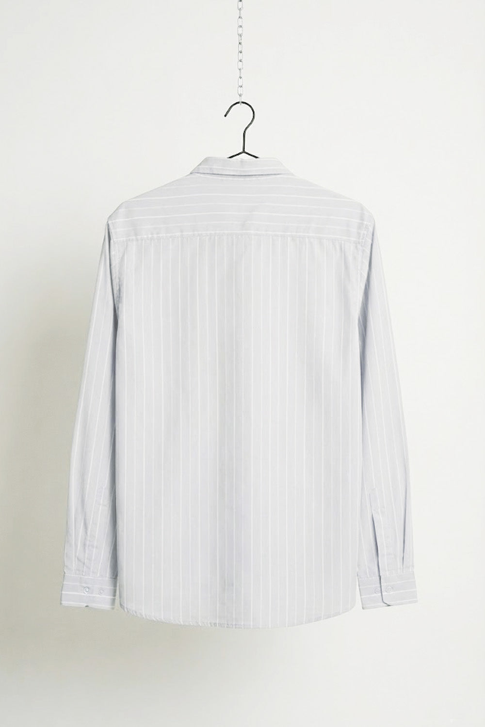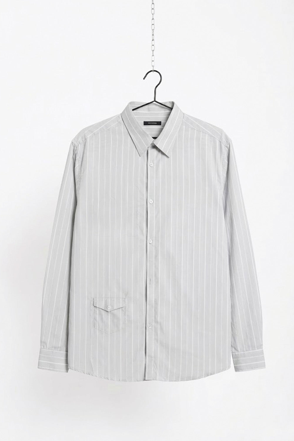 Light Grey Pinstripe Shirt, a long-sleeve button-down shirt featuring a subtle light grey and white vertical pinstripe pattern. It includes a classic pointed collar, buttoned cuffs, and a curved hem. The design is distinguished by its unique asymmetrical pocket layout: a large open patch pocket on the left chest and a smaller, button-flap utility pocket on the lower right side.