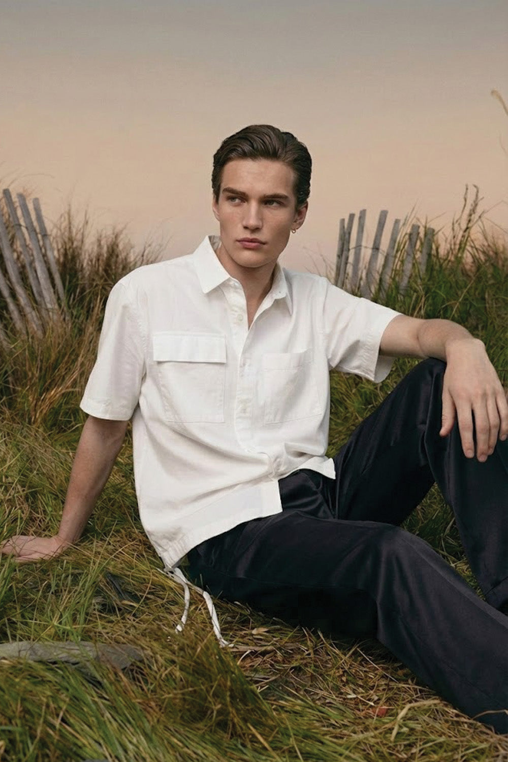 This is a white, short-sleeved button-up shirt featuring a contemporary design. Relaxed, oversized fit with a clean, minimalist aesthetic. Dual chest pockets; the right side features a prominent flap closure, while the left appears to be a standard patch pocket with coin pocket.Adjustable drawstring ties at the side hems, allowing for a customizable, cinched silhouette.