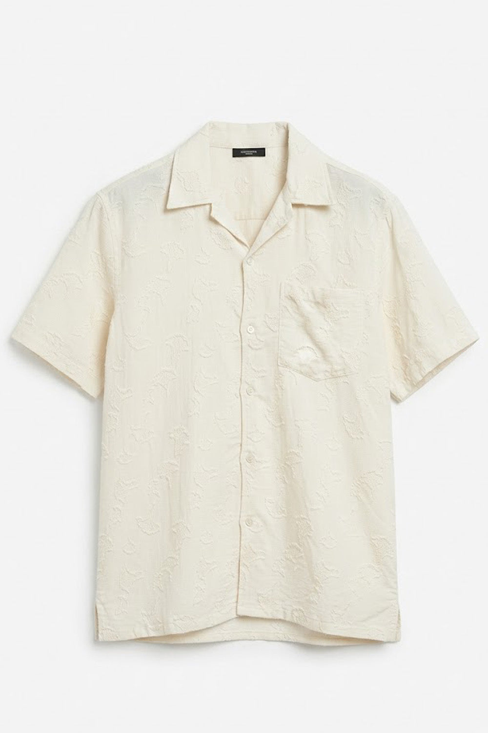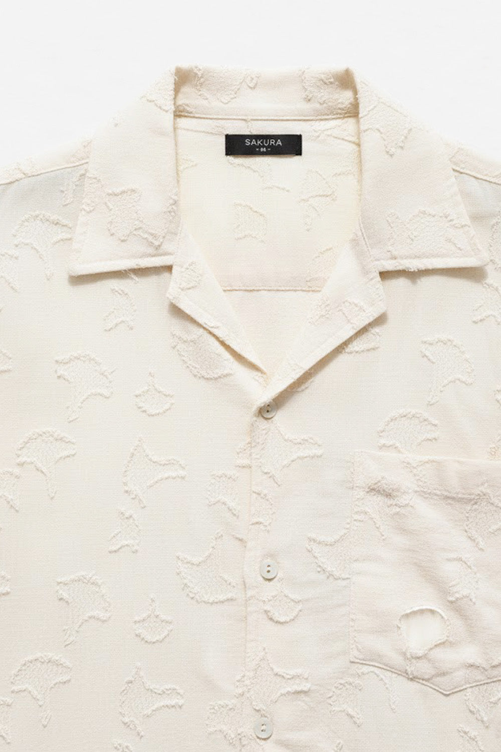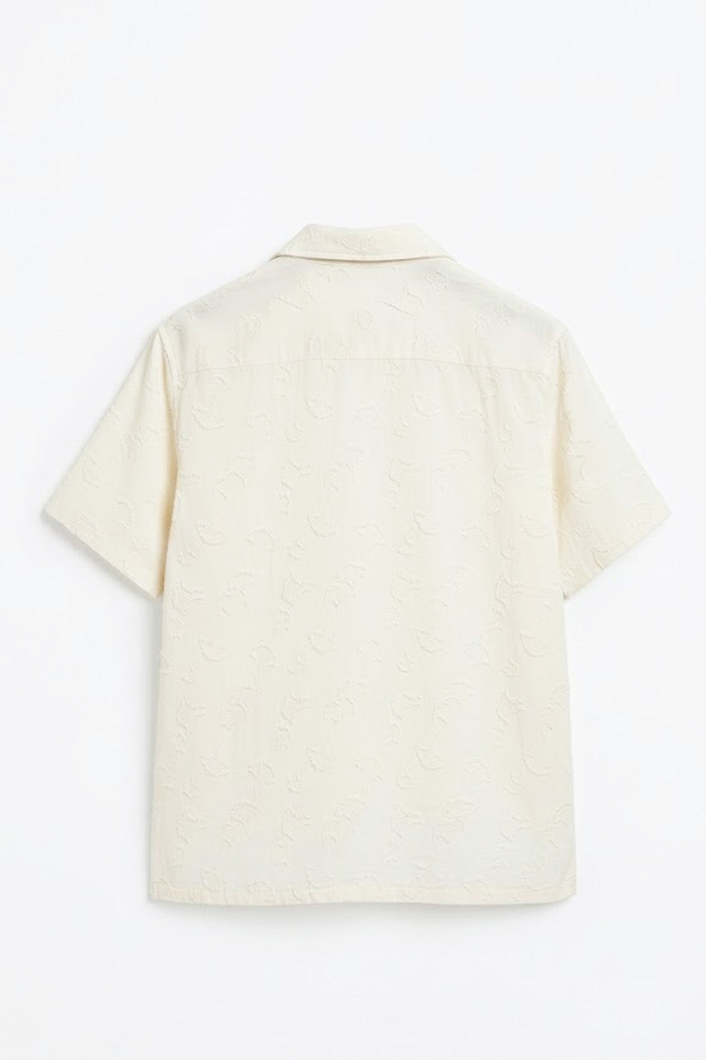 This is a short-sleeved, button-down resort collar shirt in an off-white color. The shirt features a unique jacquard , "fil coupé" (cut thread) pattern, creating a textured, fringed effect across the entire garment. Appears to be a relaxed or straight fit.