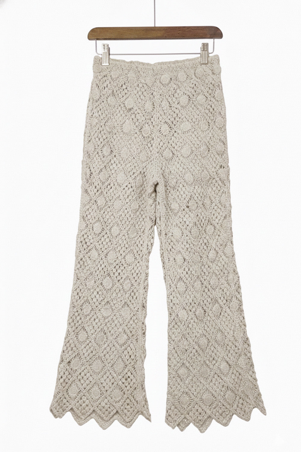 Premium Crochet Wide-Leg Trousers. A openwork crochet knit fabric featuring a geometric repeating diamond motif with raised textural details inside each shape with a relaxed, wide-leg silhouette. Finished with a distinctive scalloped or zig-zag edge at the ankles. Manufactured internationally.