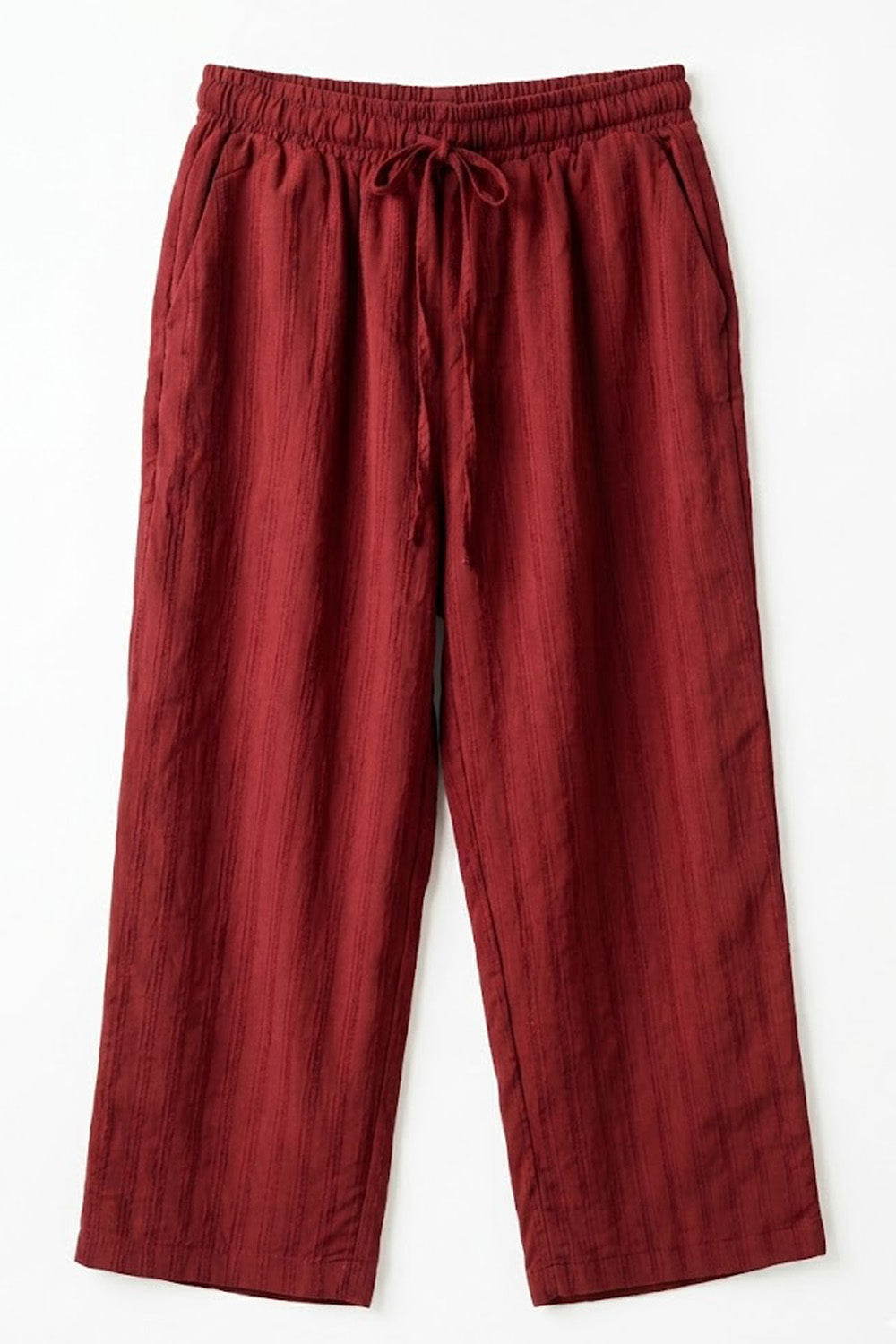 These are a pair of maroon wide-leg trousers featuring a relaxed fit, maroon hue with a subtle vertical textured stripe pattern woven into the fabric. The material appears lightweight and slightly lustrous, likely a rayon. A comfortable elasticated smocked waist with an integrated matching drawstring for an adjustable fit.