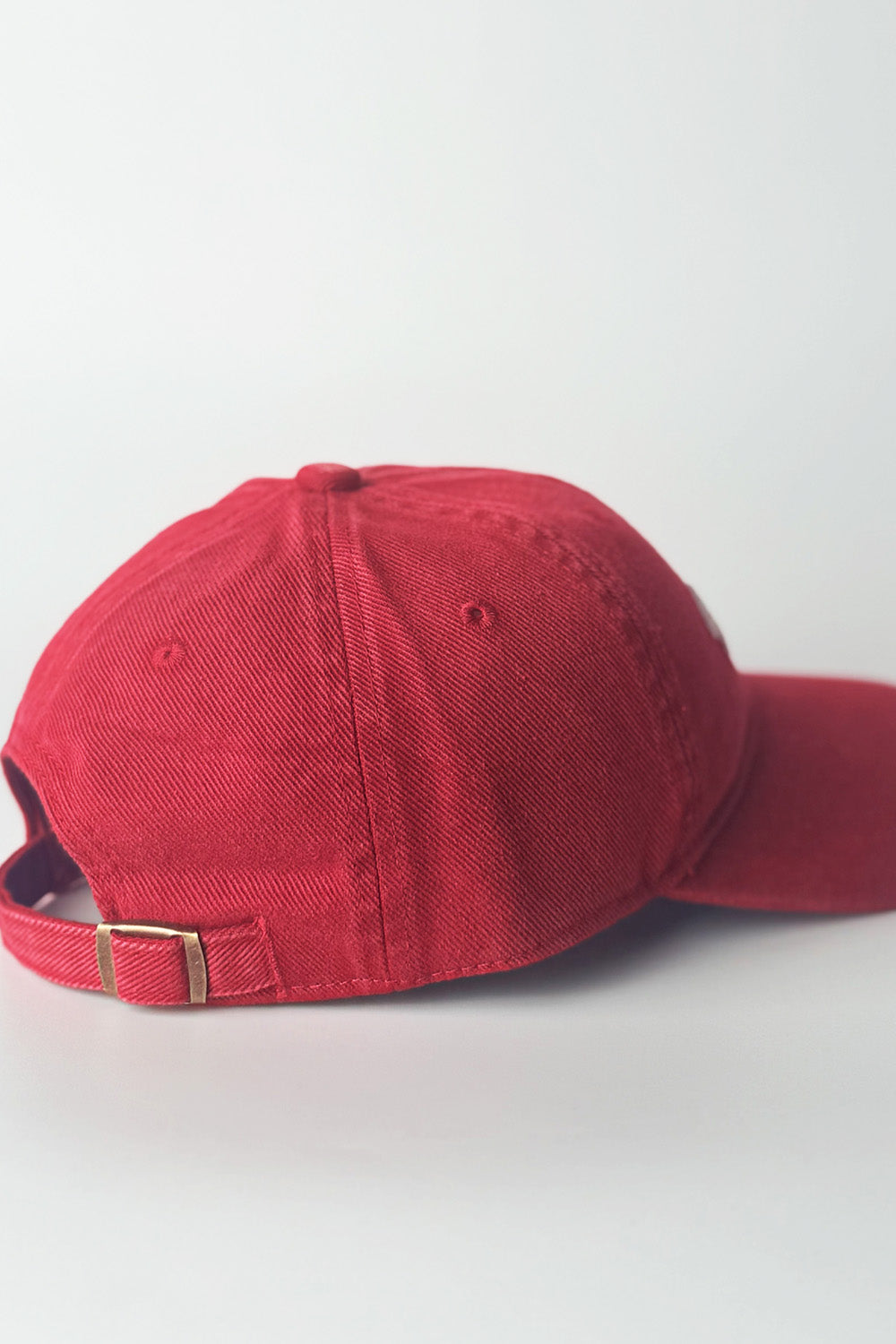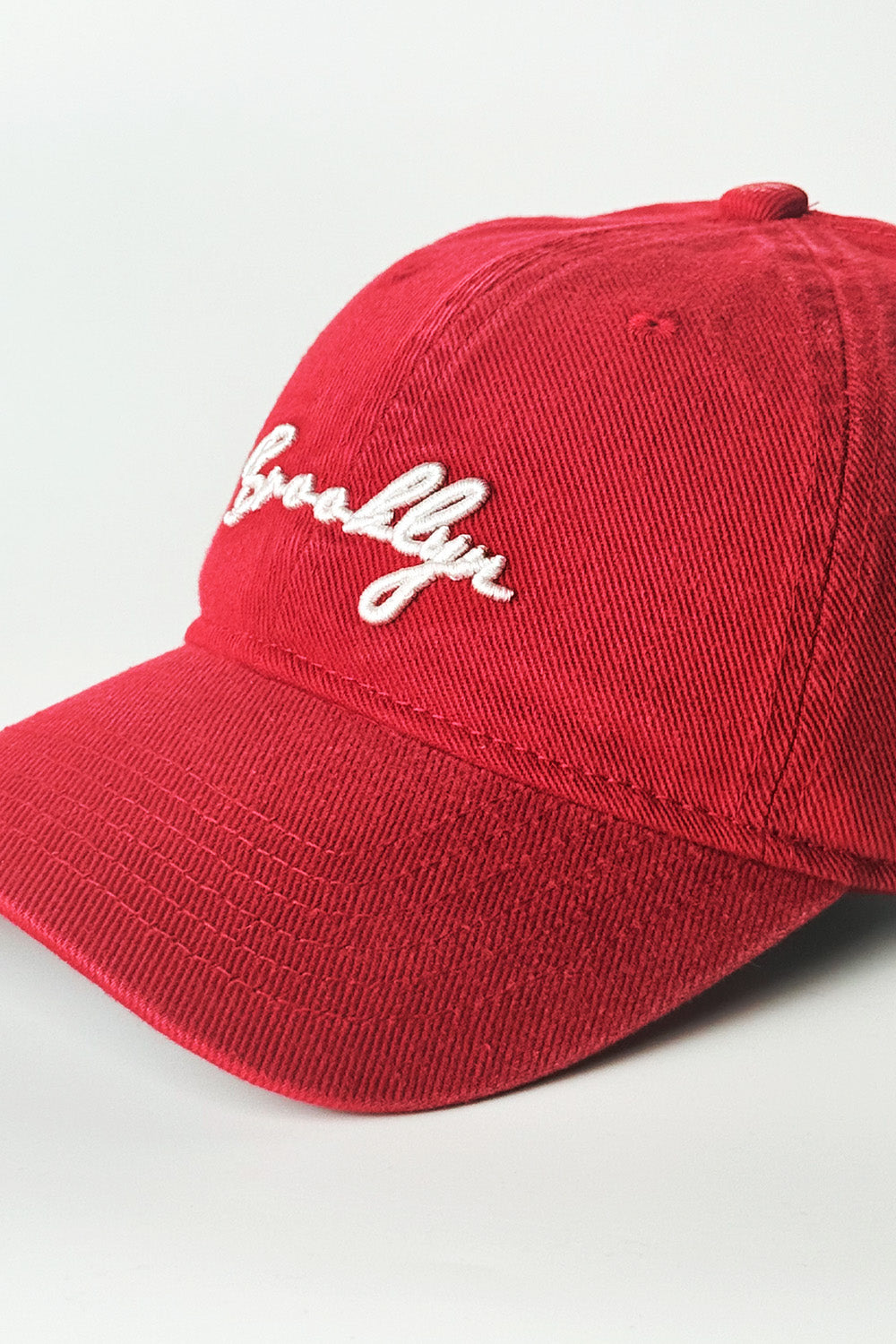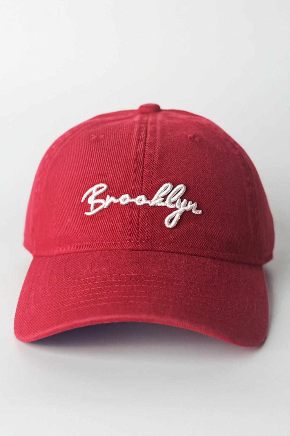 This is a vibrant red cap featuring white embroidered script that reads "Brooklyn" on the front. It has a classic six-panel, washed cotton design with a slightly curved brim, and an adjustable brass buckle closure at the back for a customizable fit.