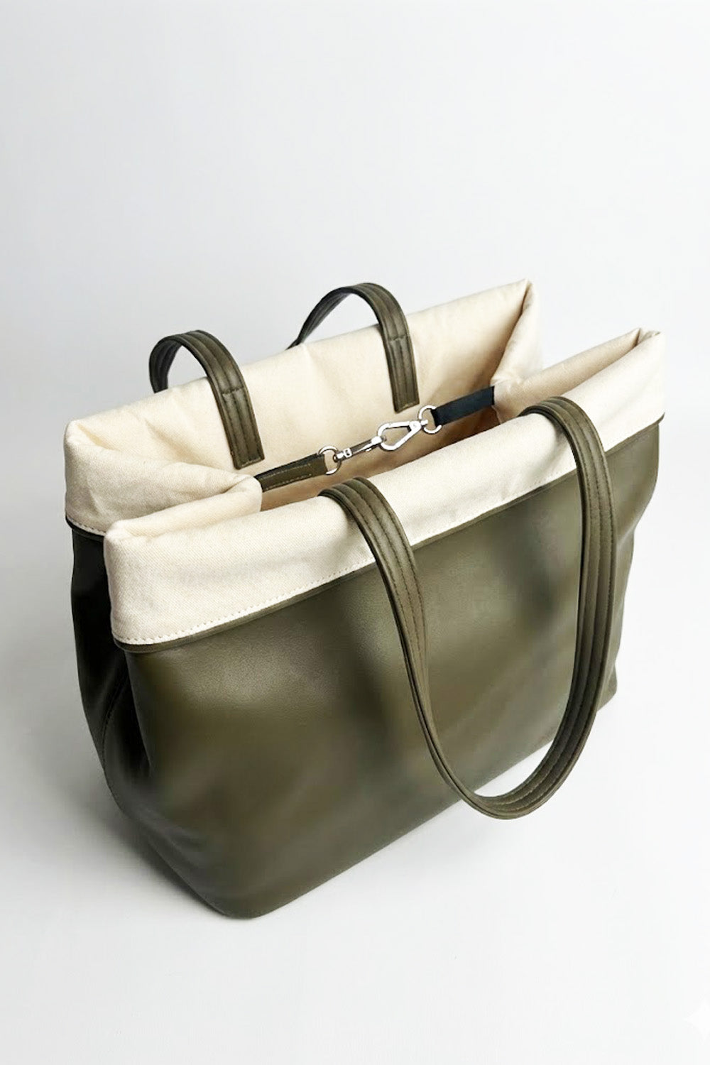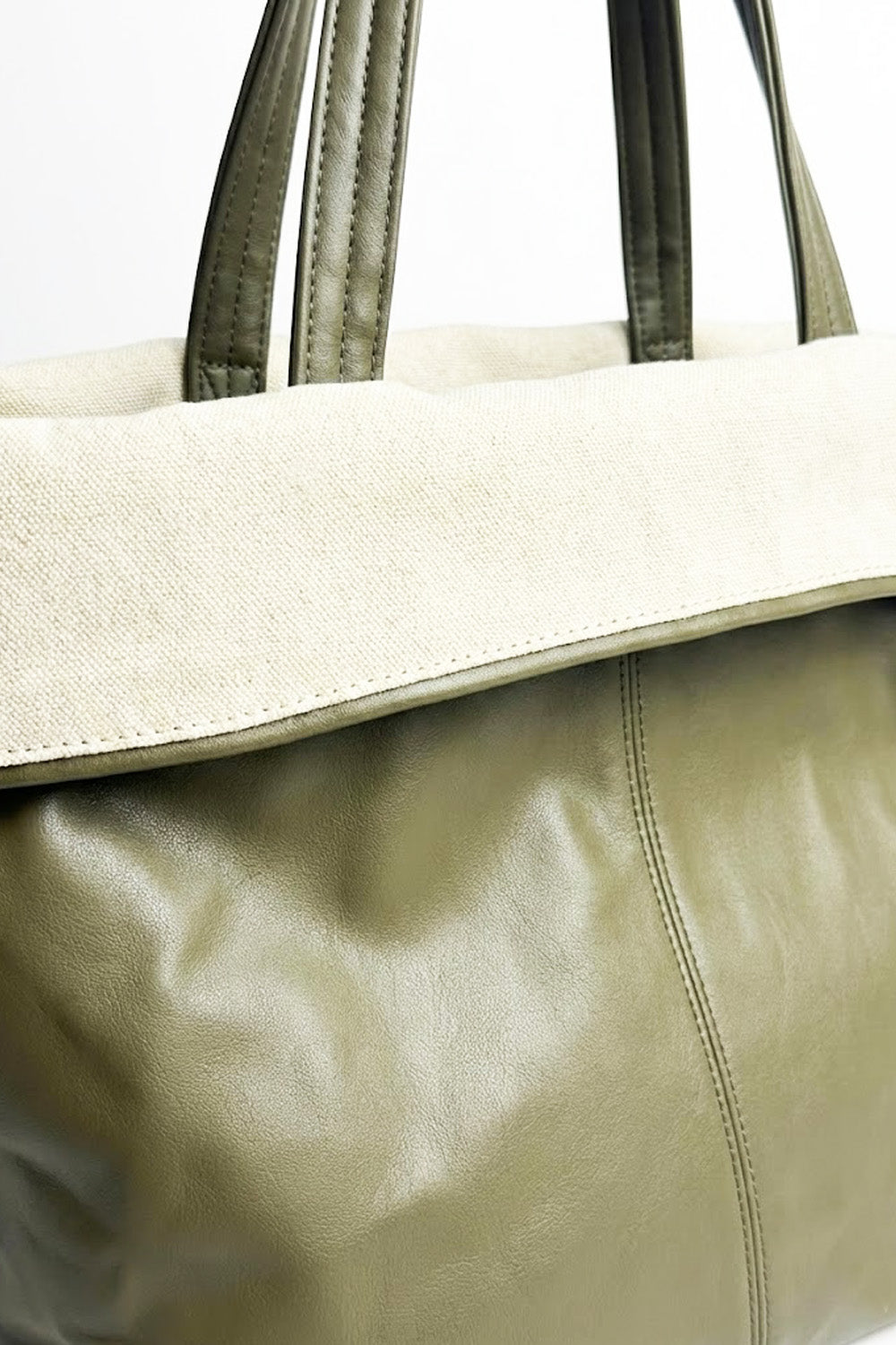 This is a slouchy tote bag. The bag has a two-tone design, combining a smooth black faux leather-look base with a folded beige canvas top and long, shoulder straps. It is accompanied by a separate, matching beige canvas zipper pouch for organizing smaller items.