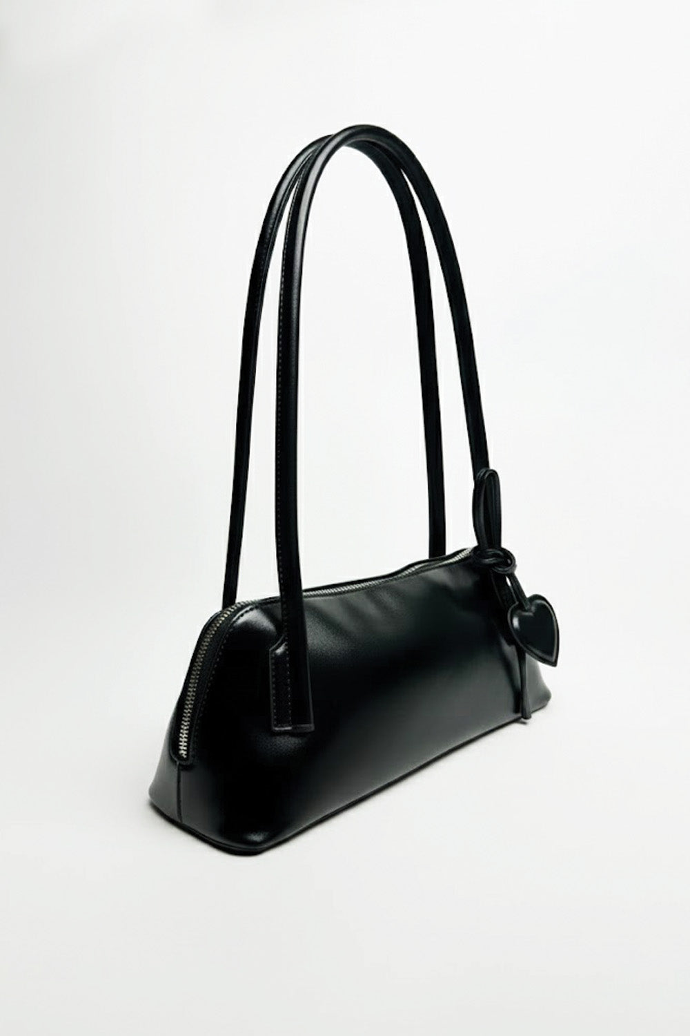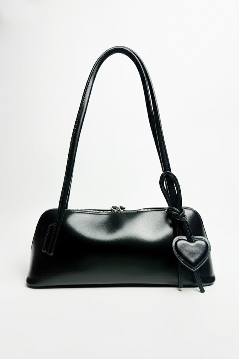 This is a shoulder bag in a deep cherry-red color. It is a rich, solid color cherry-red and appears to be made of smooth, polished high-quality faux leather. It features a slim, double shoulder strap and is adorned with a charming, heart-shaped pull charm. It has a single zip closure along the top. It's a bold yet simple statement piece.