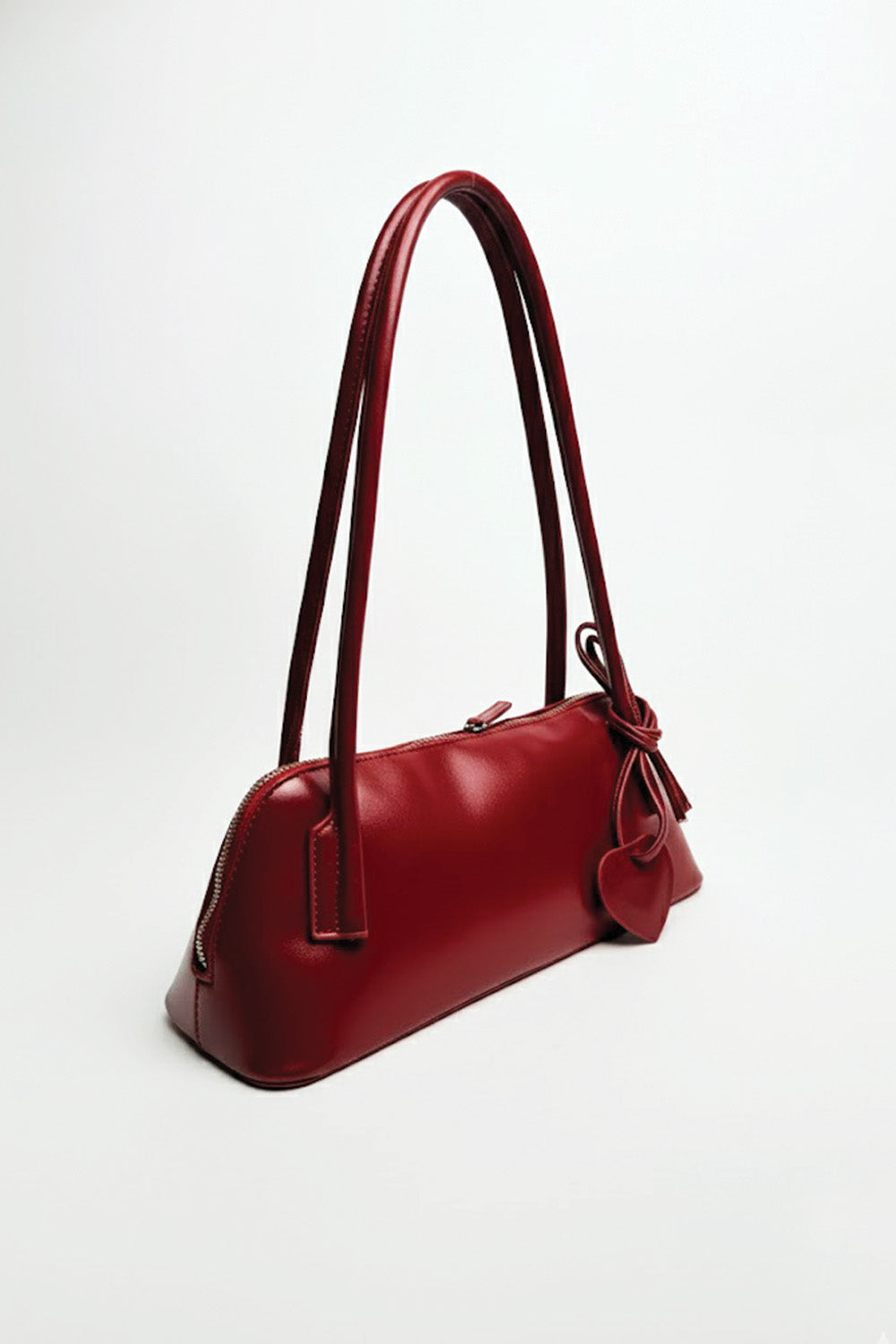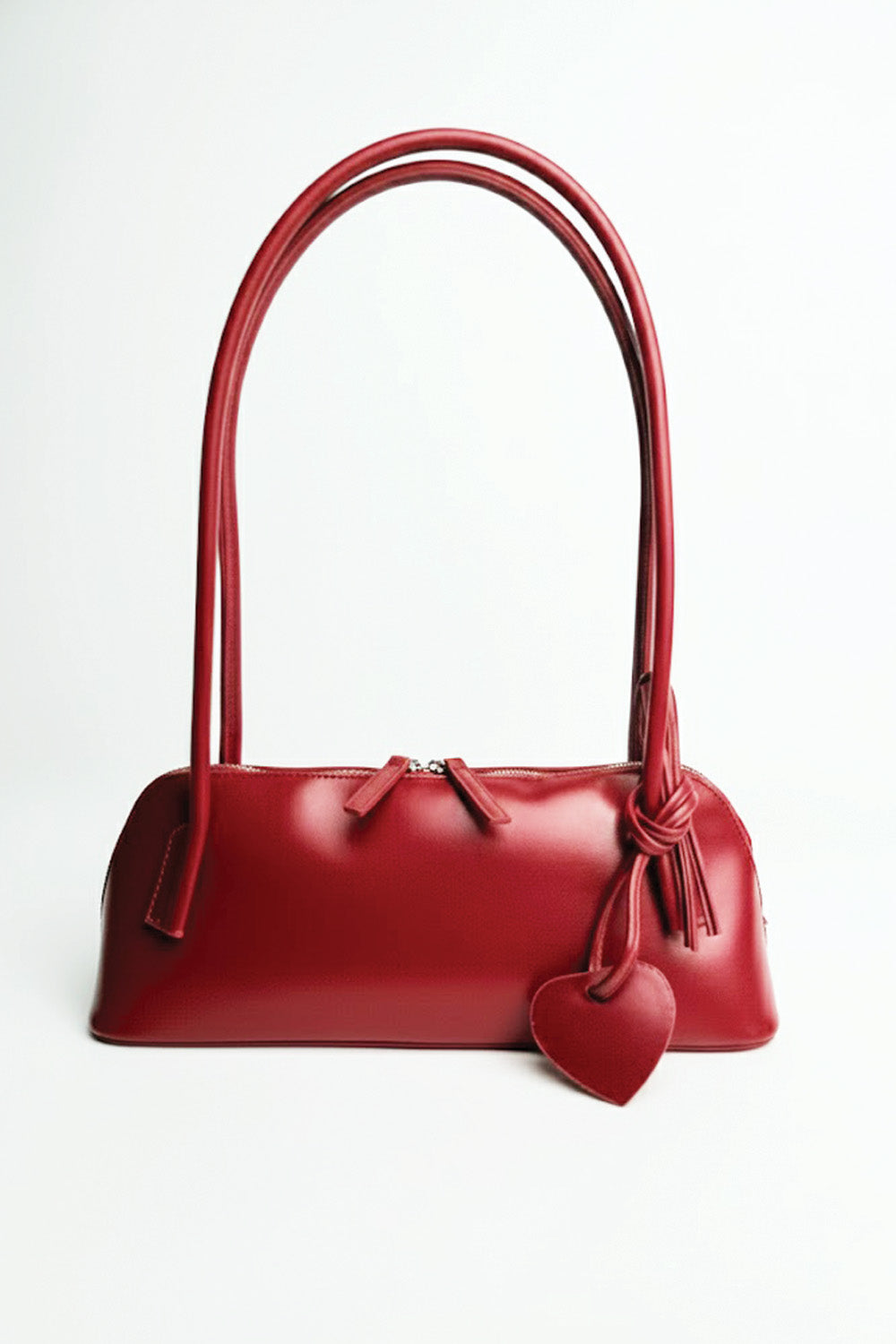 This is a shoulder bag in a deep cherry-red color. It is a rich, solid color cherry-red and appears to be made of smooth, polished high-quality faux leather. It features a slim, double shoulder strap and is adorned with a charming, heart-shaped pull charm. It has a single zip closure along the top. It's a bold yet simple statement piece.