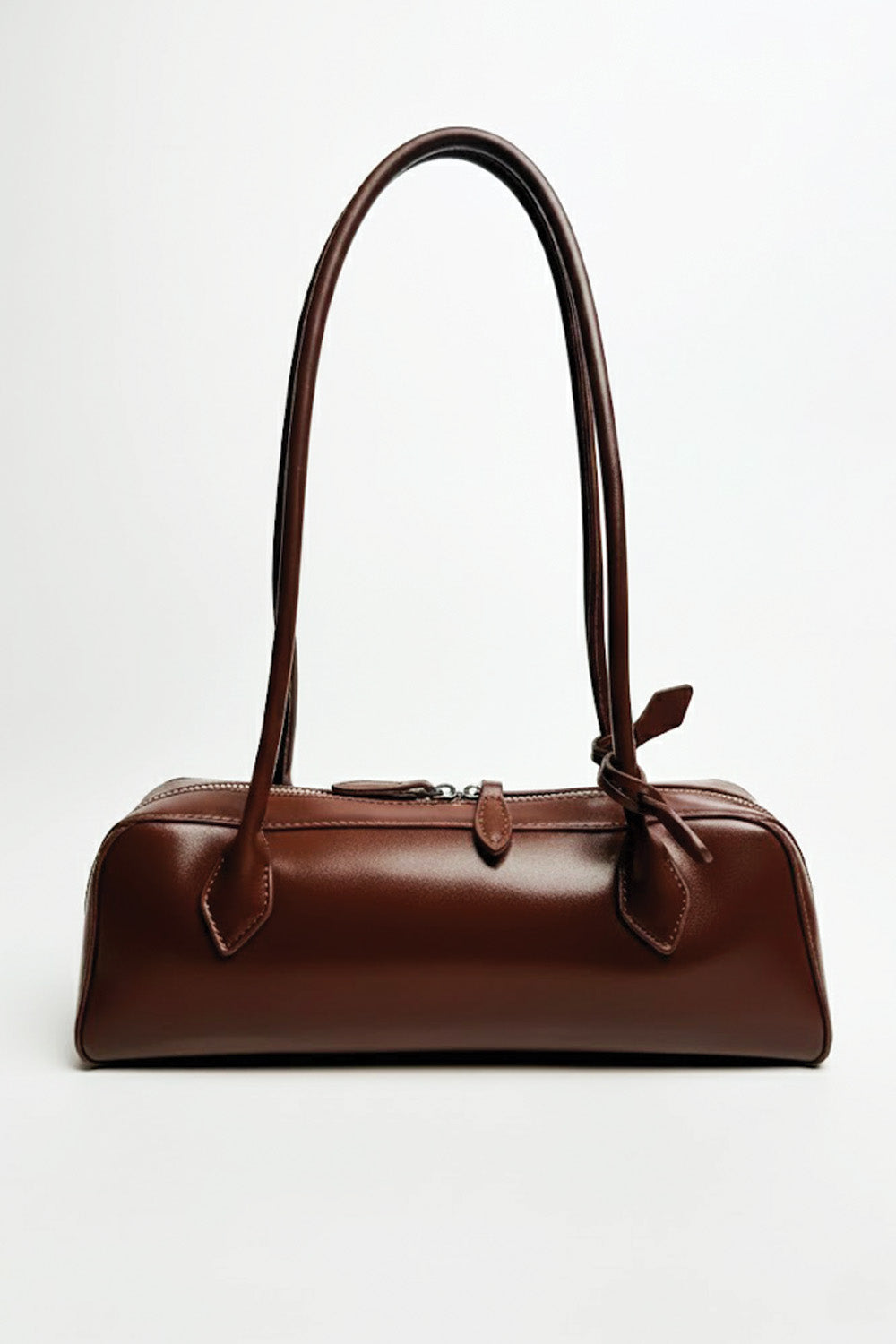 This is a sleek, dark brown, rectangular shoulder bag with a long, slender silhouette, often referred to as a baguette bag style. It appears to be made of smooth, glossy , patent faux leather and features two long, thin shoulder straps and a zipper closure along the top.It's a bold yet simple statement piece.