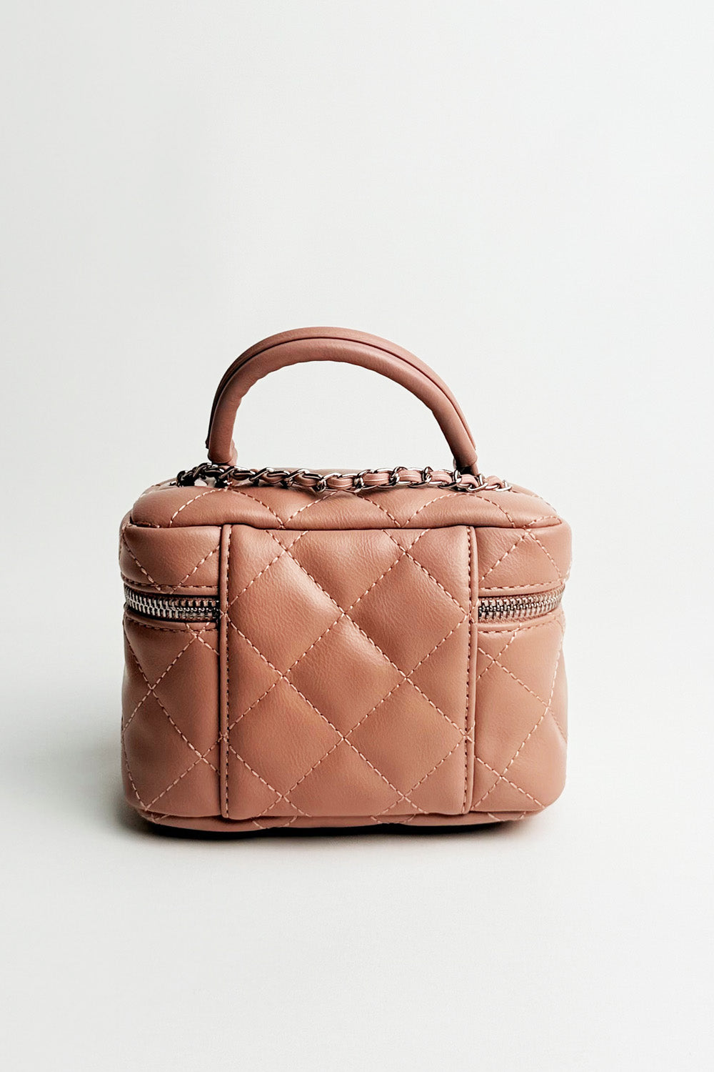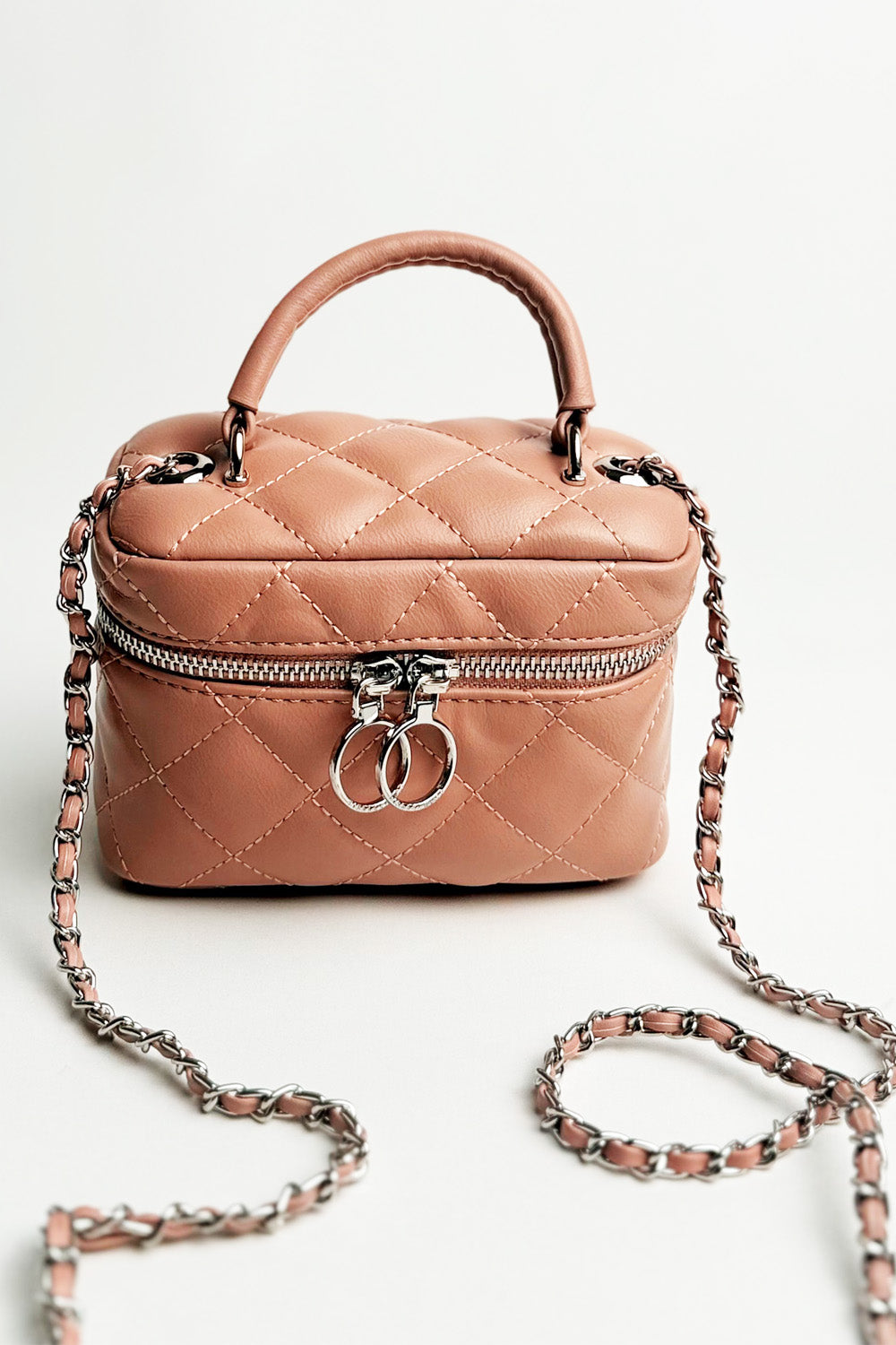 THIS IS A SMALL, QUILTED VANITY-STYLE BAG IN POWDER PINK COLOR. IT FEATURES A DIAMOND-QUILTED PATTERN ON THE FAUX LEATHER. IT HAS A TOP HANDLE AND A LONG SILVER-TONE CHAIN STRAP INTERTWINED WITH MATCHING PINK MATERIAL, ALLOWING IT TO BE WORN AS A SHOULDER OR CROSSBODY BAG. THE BAG CLOSES WITH A ZIPPER THAT HAS TWO INTERLOCKING RING ZIPPER PULLS .