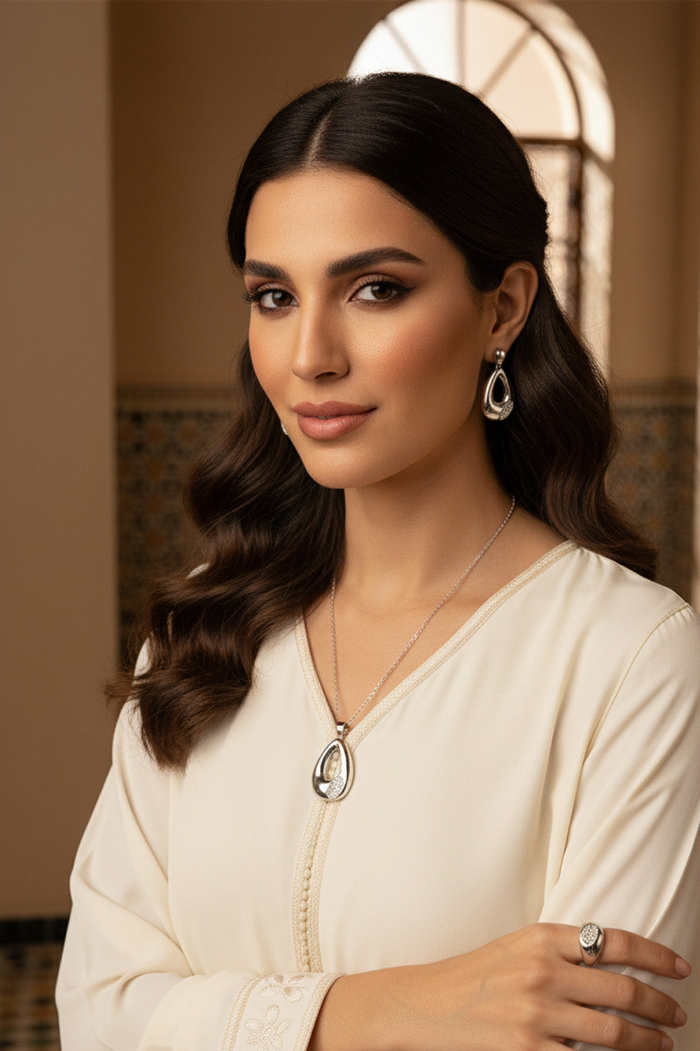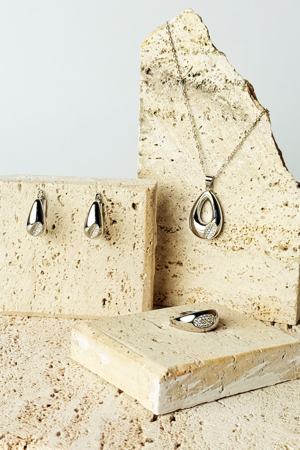 THE JEWELRY SETS ARE LIKELY MADE FROM A BASE METAL SUCH AS BRASS, COPPER, OR STAINLESS STEEL WITH A COATING OF SLVER. THE STONES ARE LIKELY RHINESTONES OR CRYSTALS PUT ON JEWELRY LAST, AFTER APPLYING MAKEUP, PERFUME, HAIRSPRAY, AND LOTION, AND LET THEM DRY FULLY. AVOID CONTACT WITH WATER AND HARSH CHEMICALS, INCLUDING CHLORINE (POOLS), DETERGENTS, AND HOUSEHOLD CLEANERS. STORE JEWELRY IN A COOL, DRY PLACE, IDEALLY IN A FABRIC-LINED BOX OR AN INDIVIDUAL SOFT POUCH TO PREVENT SCRATCHES.