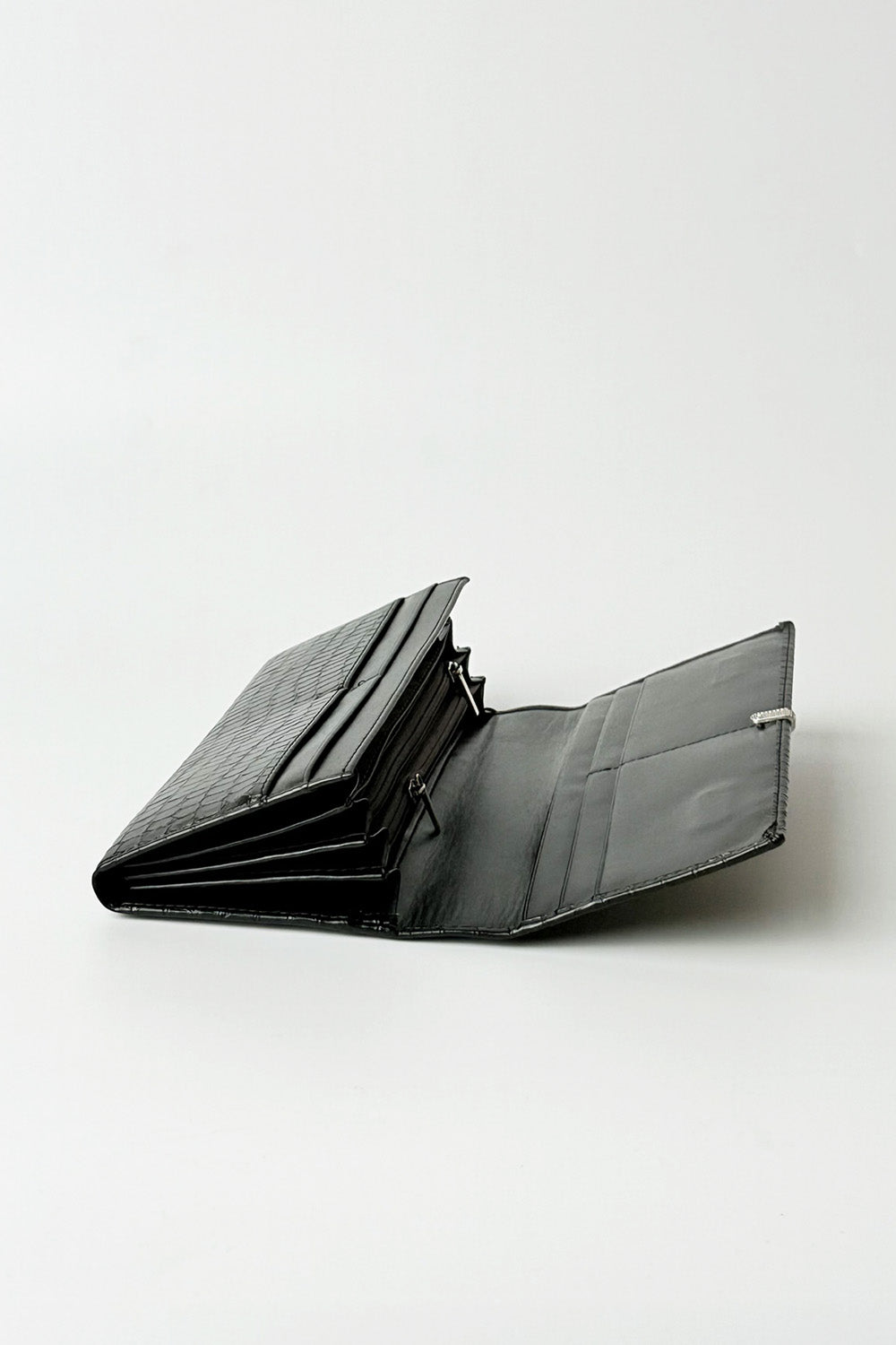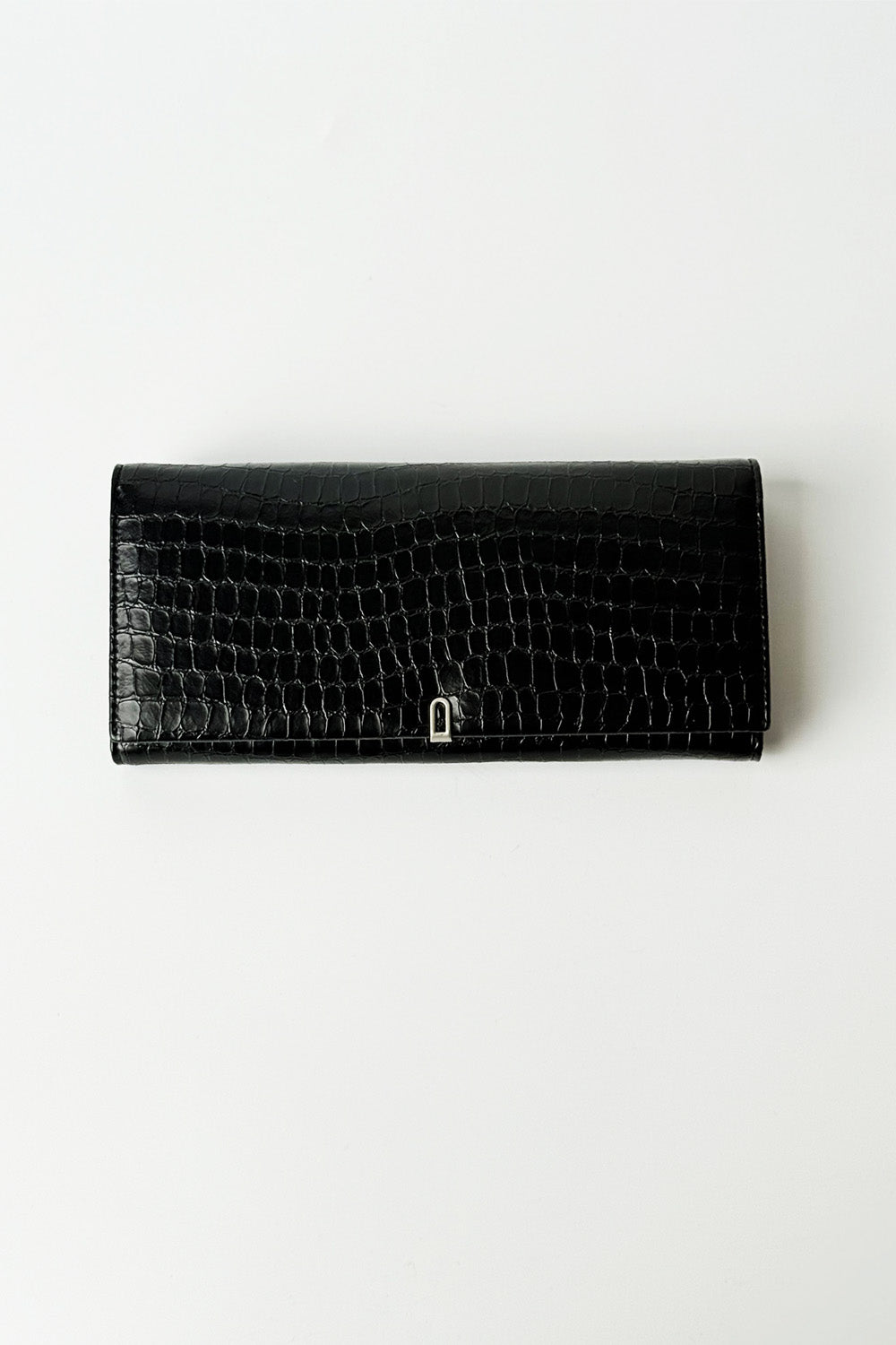 This is a sleek, black, long wallet featuring embossed texture. It has a bi-fold style with a Slver-tone clasp closure on the front flap. The interior appears to be spacious, offering multiple compartments and card slots, suggesting it's a practical choice for holding cash, cards, and coins.